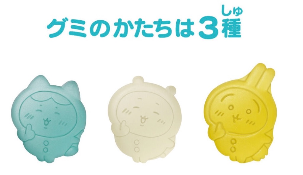 グミはちいかわ、ハチワレ、うさぎの全身を再現したかわいらしい形。